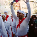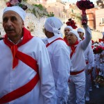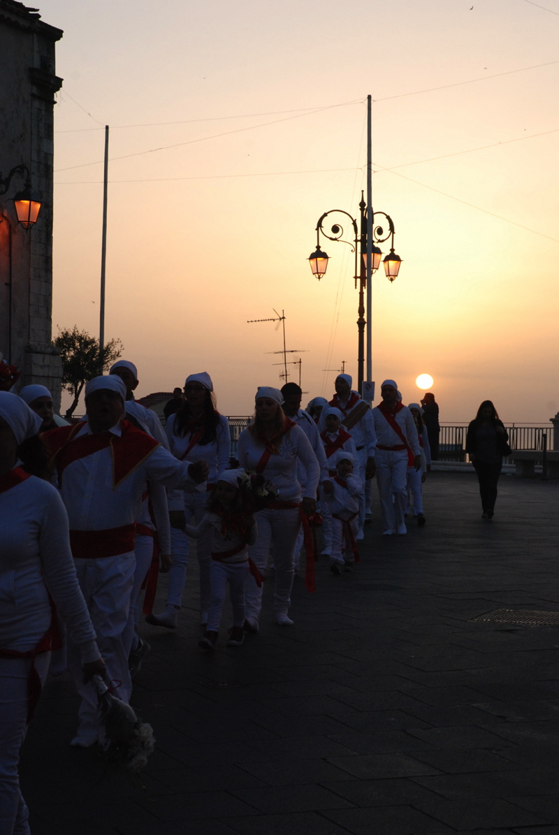 Iniziano il pellegrinaggio, in fila, uno dopo l’altro al grido “E-cchiamàmulu cà n’aiuta e c-cchiamàmulu tutti, frusteri e-ppaisani, viva Ddiu e Sam-Mastianu”.